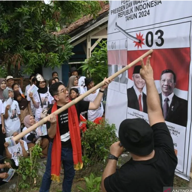 "Habis itu dilihat, paling penting adalah, yang mana? Coblos yang mana? 3 yang ini, jangan lupa Ibu Bapak, tetapi jangan di luarnya, mesti di dalam sini, cok, colok, coblos. Nanti coblos situ, ya, nomor 3-nya," ungkapnya.