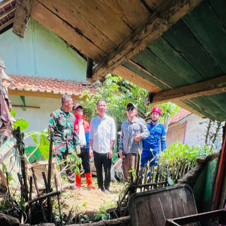 Bey mengunjungi rumah milik Mulyadi di Kampung Margadana, Desa Darmawan. Tampak rumah berwarna hijau itu ambrol di sejumlah bagian antara lain atap dan tembok.