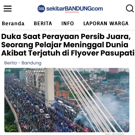 Duka pada saat perayaan persib juara, Seorang pelajar meninggal dunia akibat terjatuh di flayover pasupati