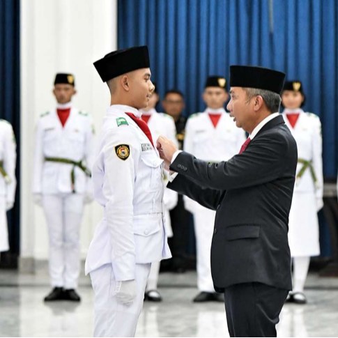 Penjabat Gubernur Jawa Barat Bey Machmudin secara resmi mengukuhkan Pasukan Pengibar Bendera Pusaka (Paskibraka) tingkat Provinsi Jabar yang akan bertugas pada upacara HUT Ke- 79 RI yang rencananya digelar di Lapangan Gasibu, Kota Bandung, Sabtu (17/8/2024).